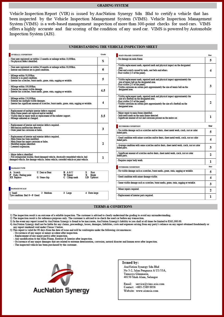 VIMS is an innovative inspection system powered by AIS Japan, complemented by ATL and enhanced by CitNOW UK. VIMS comprises two analyses – Visual Analysis (VA) and Diagnostic Analysis (DA). VA covers the exterior, interior, mainframe and basic mechanical functions of the vehicle, whilst DA is conducted using an Onboard Diagnostic 2 (OBD2) device to inspect the electronic aspects. Together, VIMS encompasses a comprehensive, 1,000-plus point inspection, all of which takes under 60 minutes to complete. This means that from inside out, and right to the electronic elements, VIMS offers a highly accurate and impartial scoring on the condition of any used vehicle. With our VIMS Vehicle Inspection Report issued within 2 working days, you can rest assured of the actual condition of the used vehicle, making your trading experience more effective, reliable and secure.Powered By